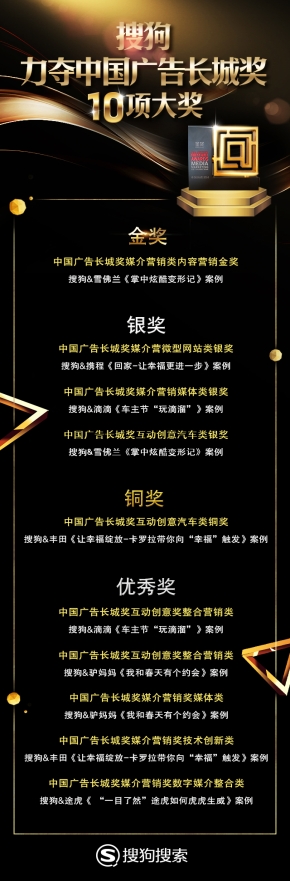10月22-24日,第24屆中國國際廣告節(jié)在長沙隆重舉行。被業(yè)界譽(yù)為“廣告賽事之泰山”的中國廣告長城獎頒獎典禮也如約而至。搜狗本次一舉斬獲10項(xiàng)大獎。其中,搜狗&雪佛蘭共同打造的《掌中炫酷變形記》案例,勇奪2017中國廣告長城獎媒介營銷類金獎。搜狗商業(yè)市場部總經(jīng)理馬艷玲也應(yīng)邀出席本次大會, 為大家?guī)砭实摹癆I ,讓營銷更智能”主題演講。