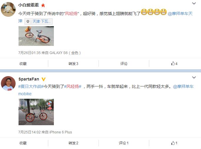率先“嘗鮮”的網(wǎng)友們迫不及待通過社交平臺分享對摩拜新車風(fēng)輕揚的騎行體驗。有網(wǎng)友稱,“今天終于騎到了傳說中的“風(fēng)輕揚”,超好騎,感覺插上翅膀就能起飛了。”一語道破了摩拜新車省力、速度快的特點。