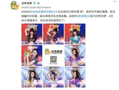 對此,龍珠已有嘗試。在此前直播西甲國家德比的營銷活動中,龍珠曾派出 8 位美女用“性感”的方式進行相關嘗試,祭出了本身的王牌美女主播“夢楠”和“狐貍”,盡管這種選擇引發了必然的討論,但從效果來看,這樣一番營銷之后,這場角逐交出了百萬打賞流水的成績。