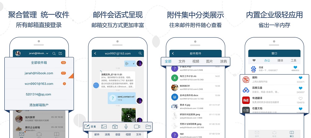 據公開資料顯示,截止到2016年6月,移動電子郵件用戶規模達到8億,80%智能手機用戶每周會接受電子郵件。既然傳統郵箱無法滿足用戶,尤其是上班族的需求,收發郵件又貫穿職場的始末,那有沒有一種產品,在取代傳統的同時又能推陳出新,“一站式”解決辦公室需求? hiibook希望把辦公室裝進口袋。hiibook這款郵箱辦理工具實現了郵箱技術與即時通訊技術的更好融合,不但是創新的第三方郵箱辦理工具,更是極簡的商務辦公和職場社交平臺 。支持綁定網易郵箱、QQ郵箱、企業郵箱等各種郵箱。