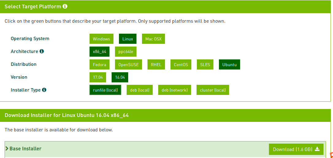 本篇文章是基于安裝CUDA 9.0的經(jīng)驗寫,CUDA9.0目前支持Ubuntu16.04和Ubuntu17.04兩個版本,如下圖所示(最下面的安裝方式我們選擇第一個,即runfile方式):