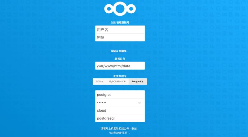 注: 但是我填的postgresql是不是有點(diǎn)眼熟,對,就是--link(方式二里面使用的net方式,目的一樣). 我的數(shù)據(jù)庫用的也是docker容器,使用--link可以將PostgreSQL數(shù)據(jù)庫的容器以別名形式傳遞過來,所以這邊直接可以使用postgresql表示數(shù)據(jù)庫(這是docker容器間的一種通信方式,注意一點(diǎn)是PostgreSQL容器一定要在nextcloud容器前啟動).