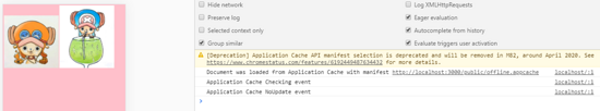 :triangular_flag_on_post: 【注】 看圖右邊控制端的輸出,因為改變了manifest文件,瀏覽器會對比新的 manifest 文件與舊的 manifest 文件,發現文件改變了,那么就會重新下載文件中的資源并進行離線存儲