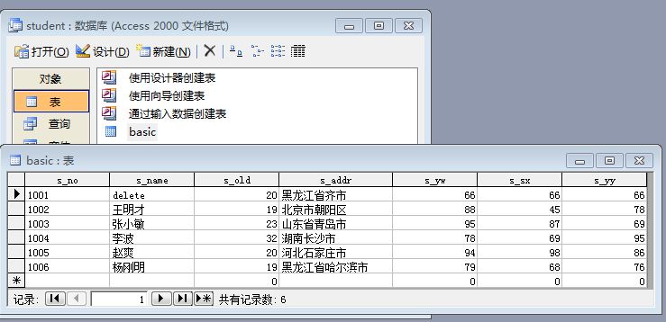 例如有如下的Access數(shù)據(jù)庫(kù)student,表basic,以及6條記錄,現(xiàn)在通過幾種方式在Jsp中將他們的數(shù)據(jù)顯示出來。如圖所示: