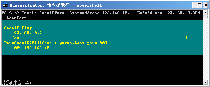 Invoke-ScanIPPort -StartAddress 192.168.10.1 -EndAddress 192.168.10.254 -ResolveHost -ScanPort -Port 80 #掃描IP段,并嘗試掃描80端口