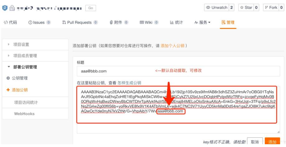 相對賬戶設置,大家比較熟悉,這里簡單描述一下項目的公鑰設置。登錄平臺->選擇項目->進入“管理”->點擊左側的“公鑰管理”->點擊“添加部署公鑰”,將剛剛生成的公鑰填寫到“公鑰”欄,并為它起一個名稱,保存即可。