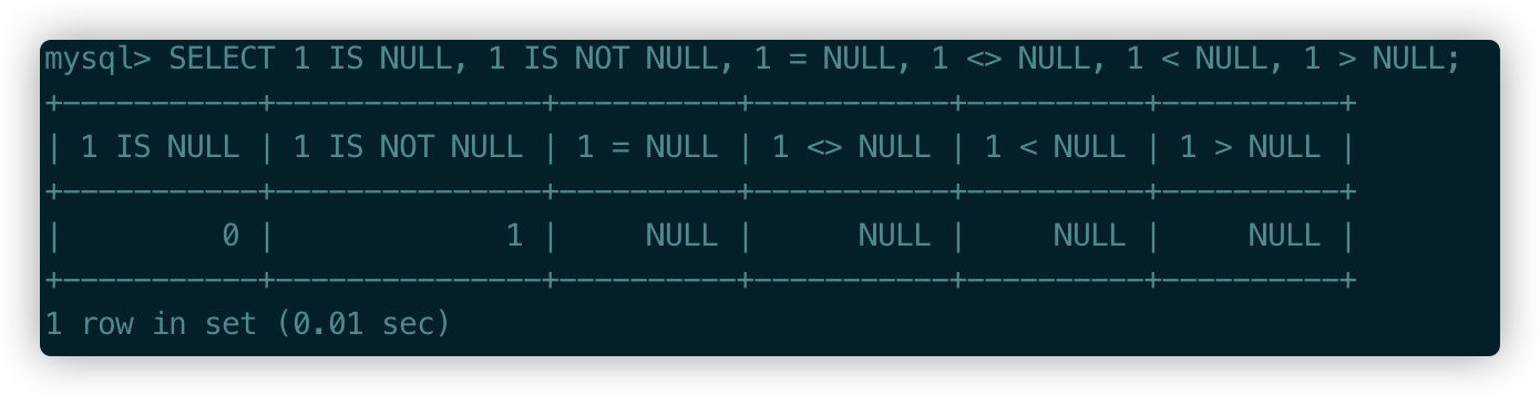 NULL和其他任何值進行運算都是NULL,包括表達式的值也是NULL。