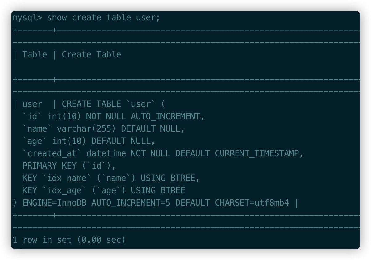 為了驗證NULL字段對索引的影響,分別對name 和age添加索引。