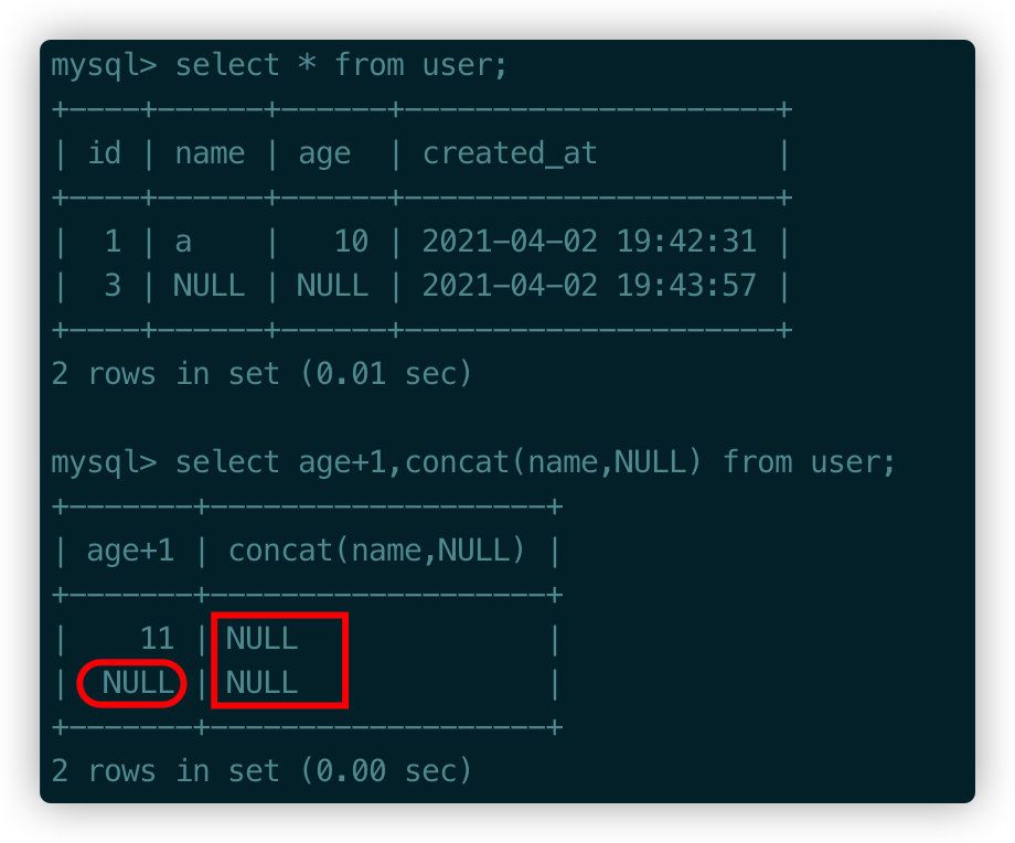 user表第二條記錄age是NULL,所以+1之后還是NULL,name是NULL,進行concat運算之后結果還是NULL。