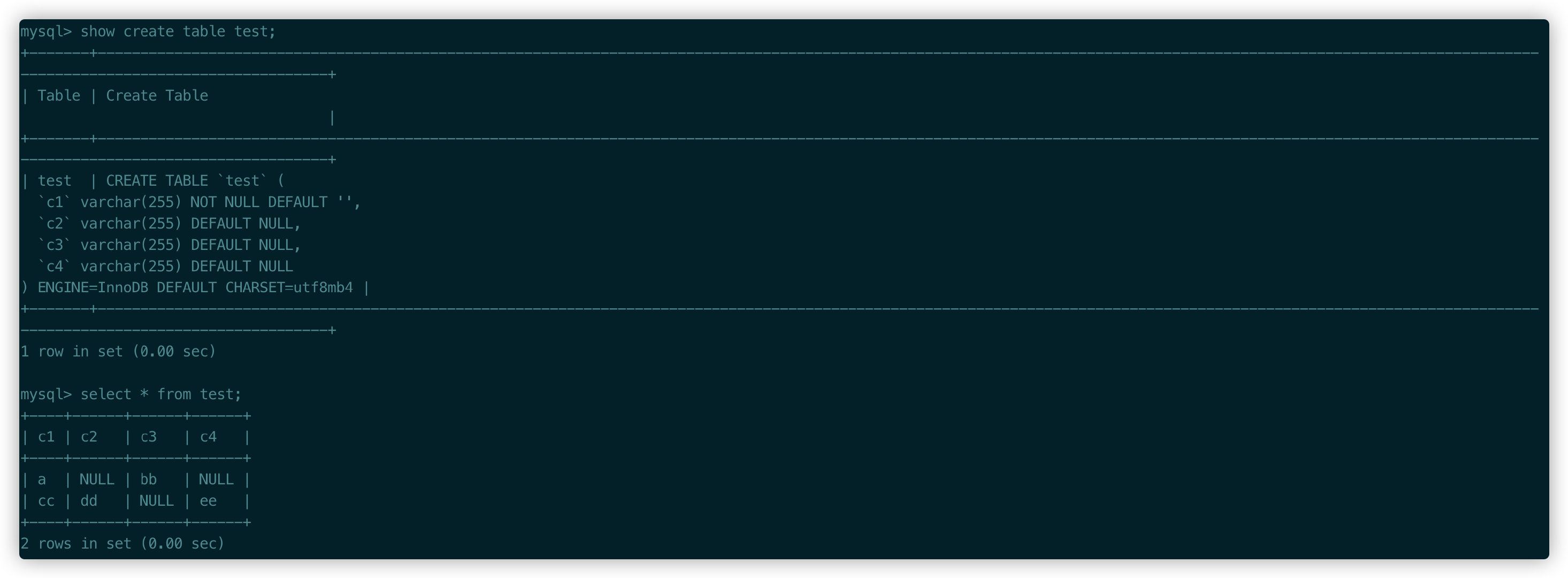為了說明清楚這個存儲格式的問題,我弄張表來測試,這張表只有c1字段是NOT NULL,其他都是可以為NULL的。