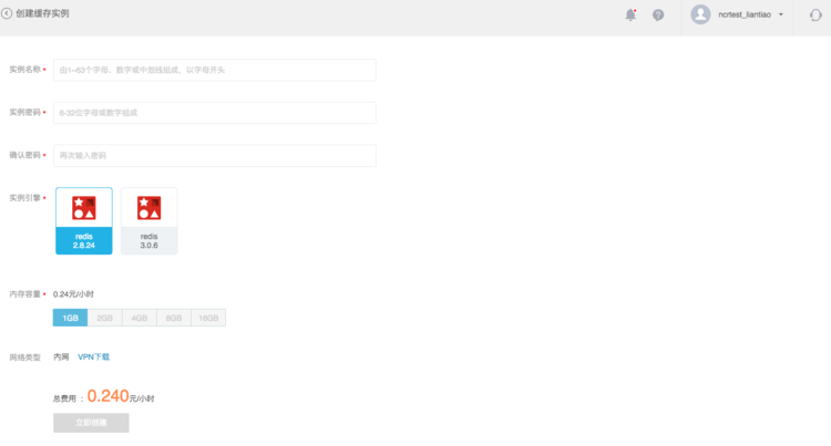 你可以在「緩存服務」主界面,點擊「創建緩存實例」來創建一個新的緩存實例,創建實例界面如下所示,操作十分便捷,只需填寫實例名稱、實例密碼,選擇實例引擎和實例內存容量,然后點擊「立即創建」按鈕,即可開始創建實例。