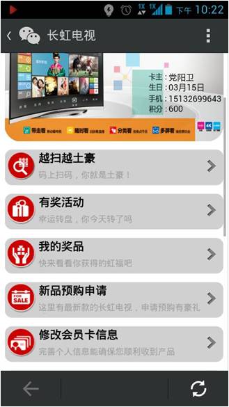 4、粉絲會員沉淀:通過一次活動吸引用戶關(guān)注,并進(jìn)行深入的互動,使其沉淀下來,并能夠認(rèn)可這個品牌,在“長虹電視”的微信里,是定期有不同的活動出現(xiàn)的,同時粉絲進(jìn)來之后進(jìn)行會員綁定,可以查詢積分,整個系統(tǒng)的設(shè)置也是考慮到了粉絲沉淀與活躍。