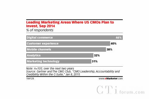 但是,當(dāng)問及明年計(jì)劃投資的營銷領(lǐng)域時(shí),數(shù)據(jù)分析卻排在倒數(shù)第二位,有32%的CMOs選擇,落后于數(shù)字商務(wù)、消費(fèi)者體驗(yàn)和移動(dòng)。和數(shù)據(jù)分析緊密相連的營銷技術(shù)排在倒數(shù)第一(31%)。