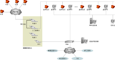 系統的核心是話路語音中心,主要實現兩大功能: 一是實現180系統的話路語音平臺; 二是實現與電話網絡的接口。以1臺Pentium級工控機作為處理平臺,2塊30線數字中繼語音處理卡,1塊帶振鈴器的24線模擬座席電話轉接卡,1塊4路傳真卡,卡間以語音處理行業的標準總線SC總線相連。系統與電信網絡的接口采用E1數字中繼線,信令方式采用中國一號信令為隨路信令,工控機用TCP/IP協議與局域網相連。