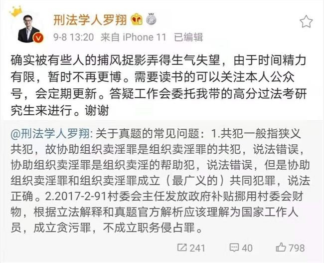 但在微博,羅翔由于不堪負面言論打擾,在9月宣布停更。