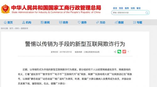 12 月 11 日消息,針對近期頻發的以傳銷形式為手段的新型互聯網欺詐行為,國家工商總局提醒稱,此類活動可能涉嫌以傳銷為手段和形式,素質上實施不法集資、擅自從事金融業務活動、詐騙等違法犯罪行為,,參與者的權益存在巨大風險,而參與傳銷也屬違法行為,其權益不受法律掩護。