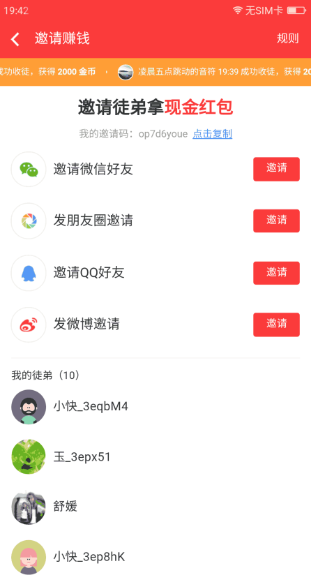 此外,快視頻用戶還可以通過收徒、拜師等方式賺錢,一次收徒拜師長期獲利。快視頻的每名用戶都可以招募多名徒弟,徒弟再收徒弟后,師傅將升格為師爺。無論是收徒,還是徒弟看視頻,師傅和師爺都可以獲得相應金額的金幣,收徒越多,徒弟越勤勞,師傅和師爺的獎勵也越多。不但如此,徒弟拜師時也將收到現金紅包獎勵,微信好友、微博好友、QQ好友都可以接受邀請成為“徒弟”,領取“拜師紅包”。