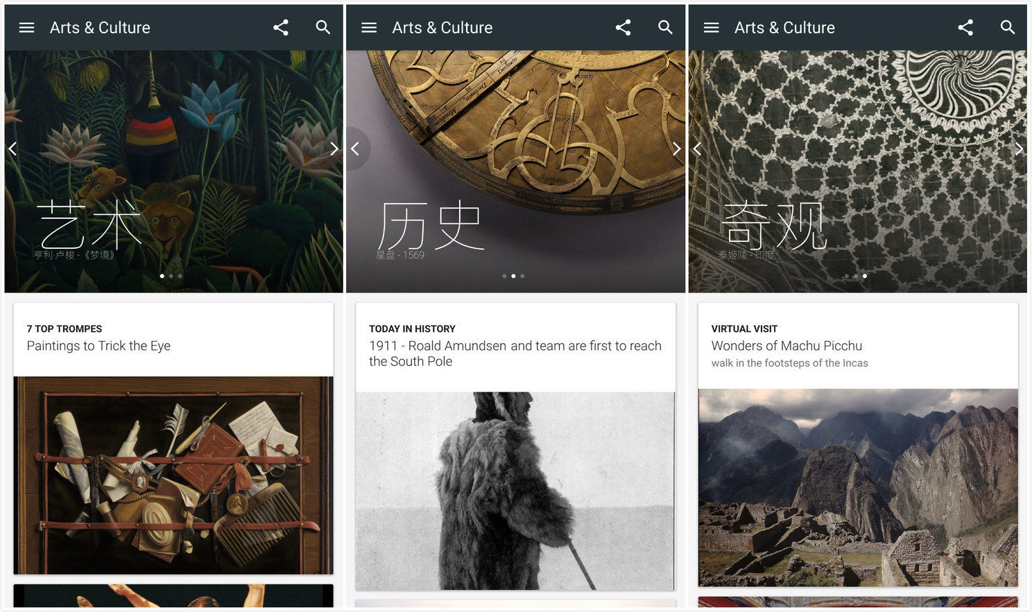 手機里的博物館「Arts&Cultural」是 Google Art Project 中推出的一款以數字化的方式展現人類歷史中藝術和文化結晶的應用,,精選了全世界超過 850 家頂級的博物館和檔案館的館藏內容,Google 和這些博物館、檔案館達都成了合作關系。通過 Google,這些人類藝術和文化歷史上的瑰寶將可以以在線展示的模式讓世界上任何一個角落的人更便利地看到它們。