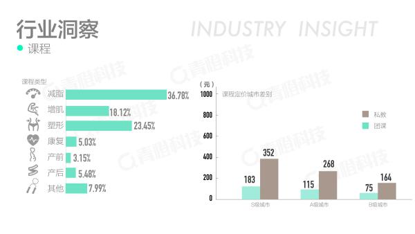 在健身房眾多的課程類型中,減脂、增肌、塑形課程仍是課程類型的核心,而其中減脂類型的課程占到總課程的36.78%,減肥是健身房消費人群持續(xù)不停的訴求。課程定價在差別的城市呈現(xiàn)較大差異,一節(jié)私教課在S級城市的平均定價可達到 352 元,而在B級城市的平均價格為 164 元,S級城市的0. 46 倍。