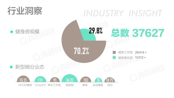 目前我國健身房總數(shù)已達到 37627 家,其中健身工作室占到了70.2%,大型的俱樂部占到整體的29.8%。