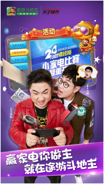 7 月 13 日,棋牌行業知名廠商途游游戲頒布頒發,著名演員大鵬和喬杉合體化身途游斗地主玩家大使,開啟暑期免費家電賽,帶領億萬玩家免費參賽,實時PK,贏取千萬家電大獎。