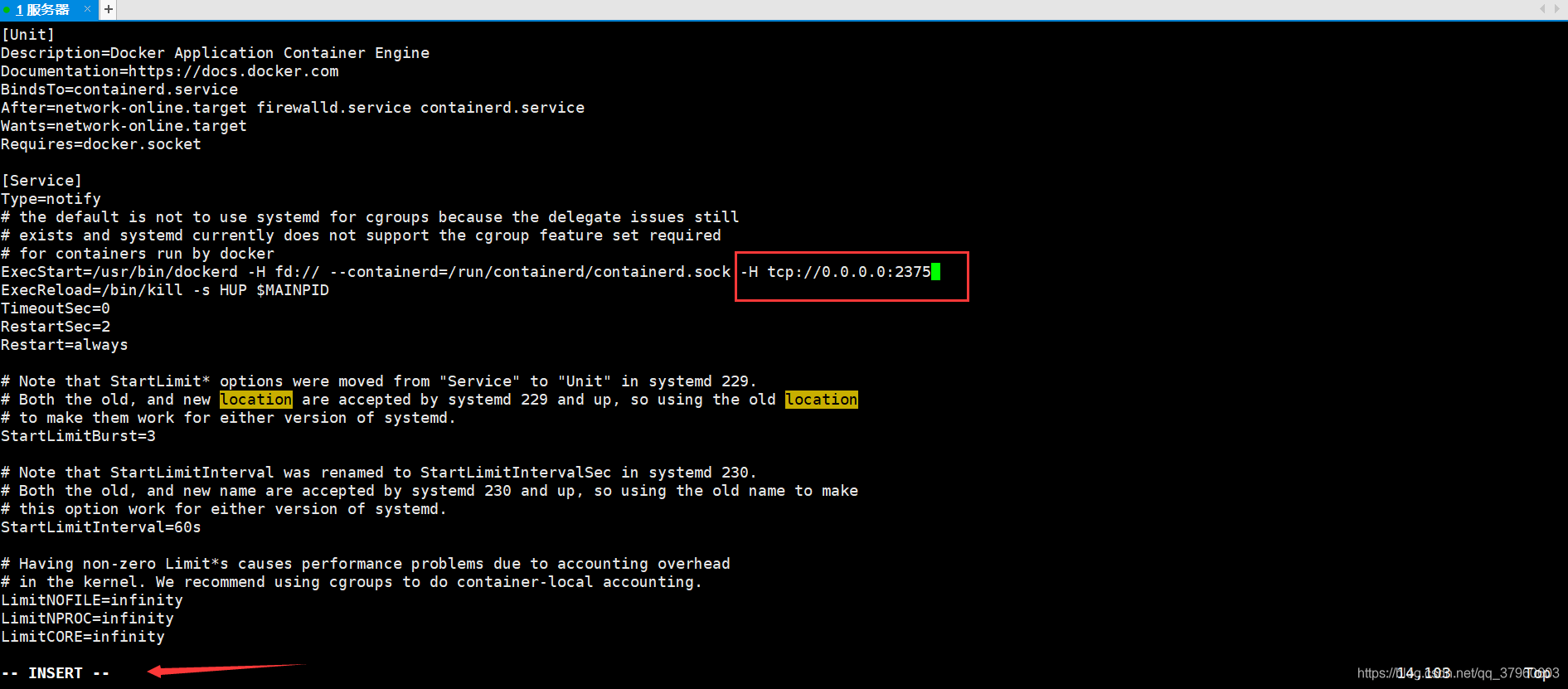 在[Service]部分,修改ExecStart參數,在最后增加-H tcp://0.0.0.0:2375,監聽所有網絡接口上的2375端口。