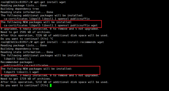 我們以apt為例,apt-get在安裝軟件的時候,可以指定一個選項: --no-install-recommends ,指定這個參數后,有一些非必須的依賴將不會被一起安裝。比如,我們安裝wget時,如果增加這個選項,待安裝的包將從6個減少為3個:
