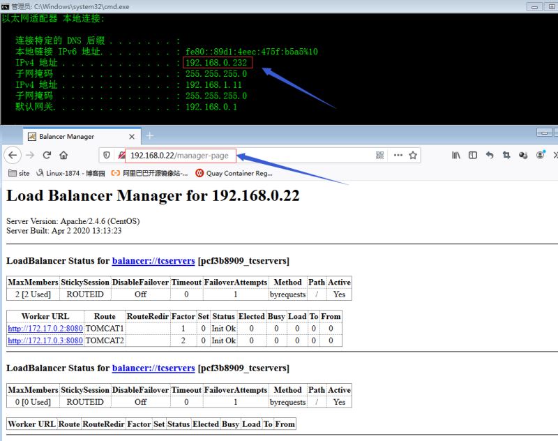 驗證:訪問宿主機上的80端口看看是否分別能夠訪問到后端兩臺tomcat容器提供的主頁?
