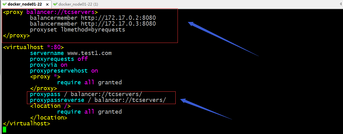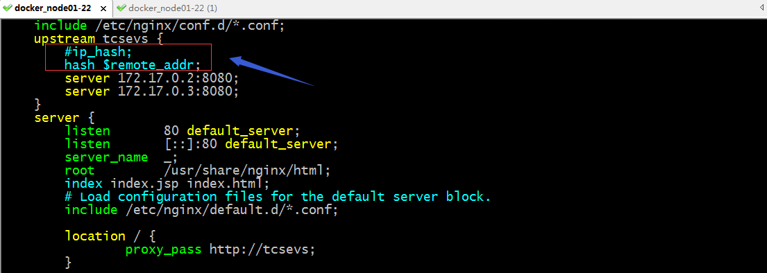 提示:以上配置就是把兩臺tomcat容器歸并為tcsevs組,然后反代/的訪問到這個組上即可。這樣配置默認是輪詢的;