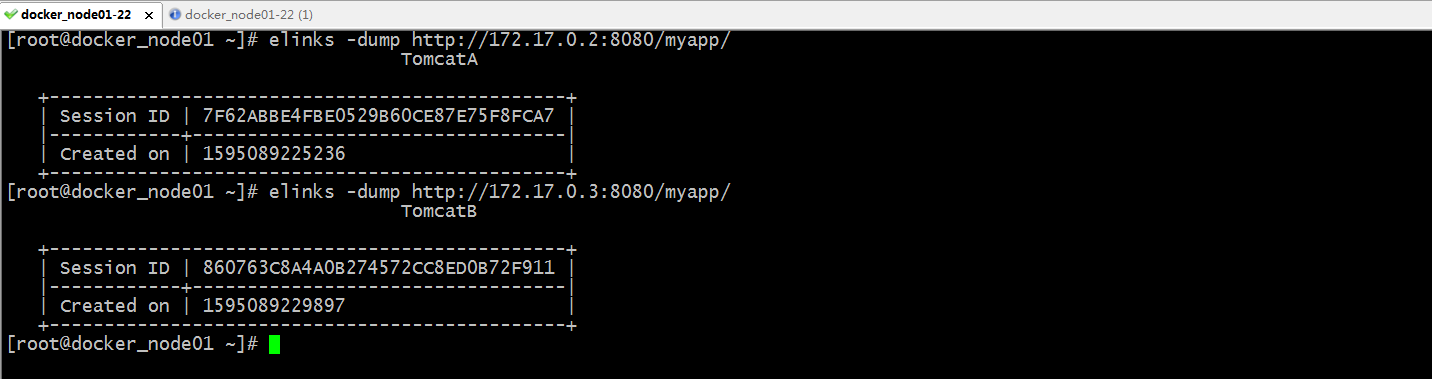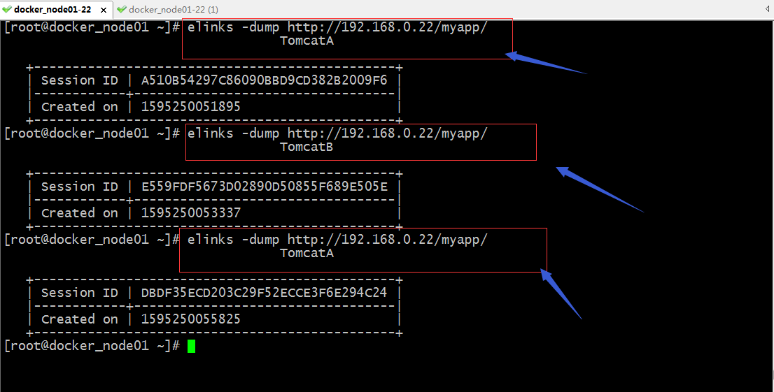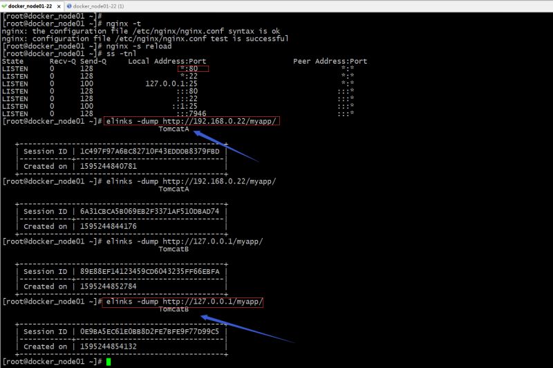 提示:可以看到訪問宿主機的80端口是能夠正常訪問到后端tomcat服務器上的,并且也看出了默認輪詢調度的效果;但是這里存在一個問題,同一用戶訪問宿主機的80端口,給我們響應的結果session id都不同,這意味著nginx并沒有追蹤到用戶的狀態信息,原因是因為http請求本來就是無狀態的,為了讓服務記錄用戶的狀態信息,在nginx上我們可以基于源ip做調度,什么意思呢,就是同一源ip地址,nginx都把該請求調度到同一臺后端server上,使得同一用戶訪問的狀態信息始終調度到同一后端server上;