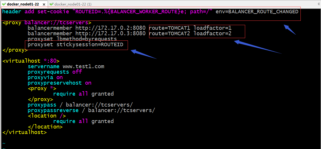 提示:以上配置表示給客戶端請求cookie首部添加一個標識,ROUTEID=%{BALANCER_WORKER_ROUTE}e表示,我們指定的ROUTEID標識的值為balancermember 后面的route屬性指定的值;env=BALANCER_ROUTE_CHANGED表示,如果我們指定的route的值發生變化時,它需要重新調度;簡單講就是給cookie信息打標簽;proxyset stickysession=ROUTEID 表示給該組所有成員設置會話粘性KEY的名稱為ROUTEID,這個值通常要和上面的set-cookie后面的KEY對應;如果把它寫到每個balancermember后面表示單獨給某個server設置會話粘性KEY的名稱;如果寫在proxy配置段里需要用proxyset指令來設置,表示給該組的所有member設置 stickysession;簡單講就是聲明以那個key來當做會話粘性的基準來做調度;這個邏輯和haproxy里面的會話保持設定類似;有關haproxy配置會話保持可以參考https://www.jb51.net/article/33639.htm;