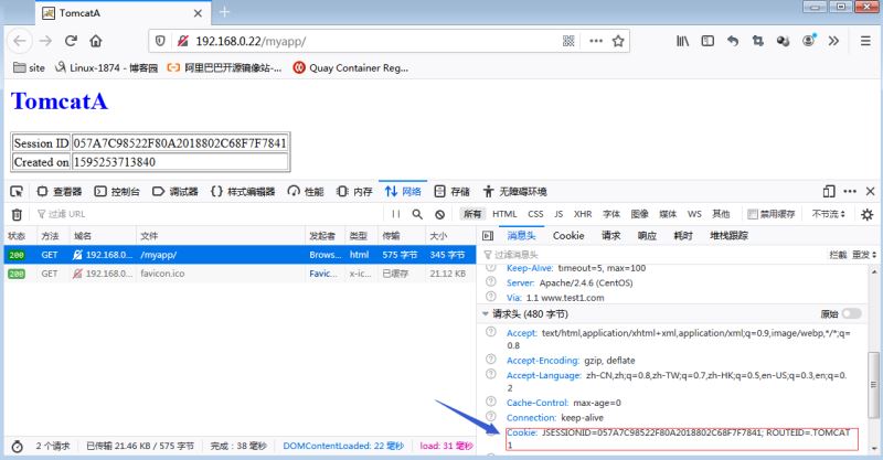 提示:可以看到客戶端在請求首部cookie中,把之前set-cookie中的值都攜帶過去了;此時httpd收到客戶端請求就可以根據設置的stickysession 指定的KEY來判斷該把對應請求發送到那個后端server上進行響應了;這樣一來,只要客戶端的cookie不變,那么它每次訪問服務端都會以cookie首部的值去告訴服務端該調度到那臺后端server上;