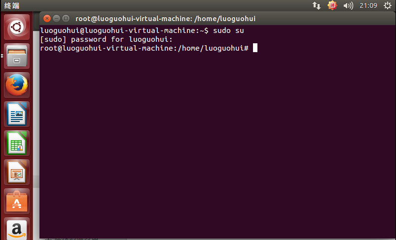 6、下面我們快捷鍵Ctrl+Alt+T,啟動命令框,然后切換到root用戶(切換命令為:sudo su,回車然后會提示你輸入當前登錄用戶的密碼,輸入成功后即可進入root用戶):