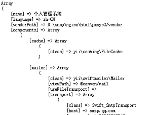 可以看到入口文件引入了幾個配置文件,并將所有配置文件的內容都合并到$config這個配置數組中,然后使用這個配置數組作為參數去創建一個應用實例。若將這個配置數組打印出來,就會看到,“components”下標對應的元素包含了yii組件的參數信息(這里只截圖一小部分):