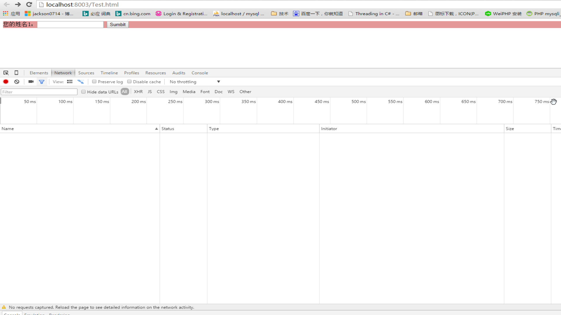 2.輸入“Jackson0714”然后點擊Sumbit按鈕,頁面不會刷新,在最下面顯示"Hello World Jackson0714"