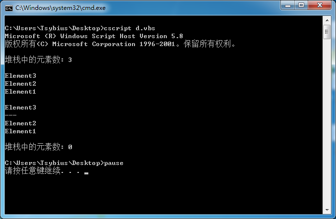 腳本文件:d.vbs,包含堆棧的添加元素(壓棧)、刪除元素(出棧)、遍歷、統計元素個數、清空