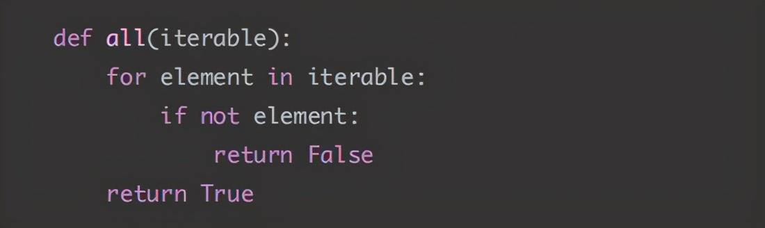 參數為一個可迭代對象,如果該可迭代對象所有元素的真值都為True(或者可迭代對象為空),則返回True。它等價于: