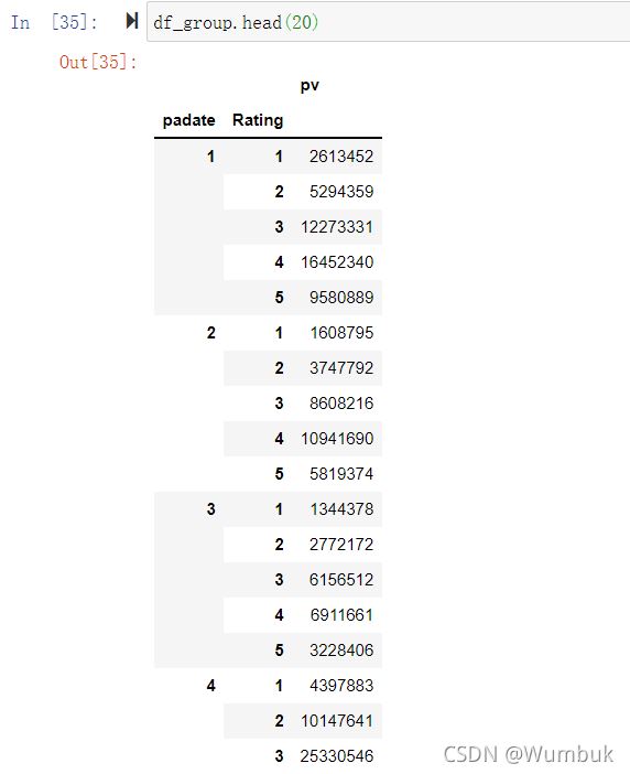 df_group=df.groupby([df["padate"].dt.month,"Rating"])["UserID"].agg(pv=np.sum)