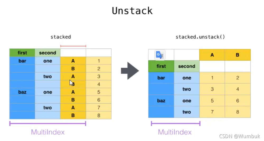 unstack:DataFrame.unstack(level=-1,fill_value=None),將index變成column,類似把豎放的書變成橫放