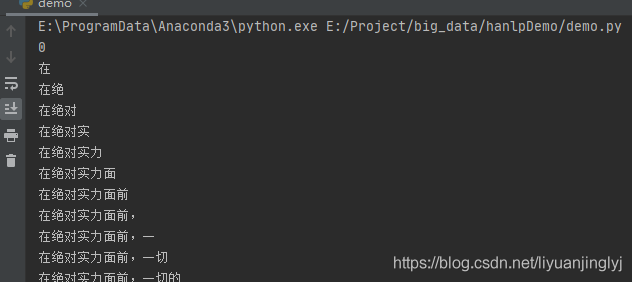 算法的原理:首先通過while循環(huán)判斷i是否超出了字符串的大小,如果沒有,獲取當(dāng)前第一個字符串為第一個最長匹配結(jié)果,接著遍歷第一個字符串的所有可能組合結(jié)尾,如果在字典中,判斷當(dāng)前詞語是否大于前面的最長匹配結(jié)果,如果是替換掉最長。遍歷完成之后,將最長的結(jié)果添加到列表中,然后再獲取第二字符,遍歷所有結(jié)尾組合,獲取最長匹配。以此類推。