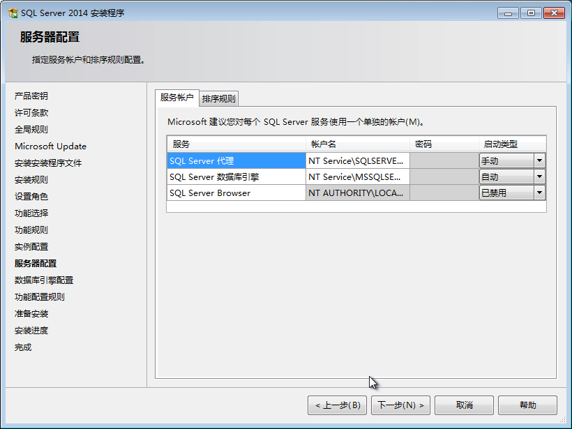 13、這里,使用默認的賬戶配置信息。單擊“下一步”按鈕,彈出“數據庫引擎配置”對話框。