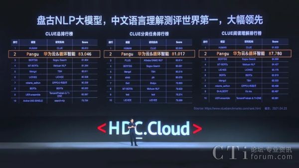 盤古大模型由循環智能(Recurrent AI)和華為云聯合開發,鵬城實驗室提供算力支持。這是業界首個千億參數的中文大模型,擁有1100億密集參數,技術性處于行業頭部地位。在業內權威的中文語言理解測評榜單「CLUE」上,「盤古」在總榜、閱讀理解排行榜和分類任務排行榜上都位列第一,總榜得分比第二名高出一個百分點。