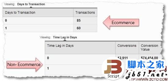 如果我們的是非電子商務網站,那么通過Google Analytics多渠道路徑(Multi-Channel Funnel),查看“Time Lag”報告,可以獲得許多驚人欣喜的結果。電子商務網站同樣可以查看數據“購買前所耗天數(Days to Transaction)”。我們即刻看到的度量是“轉化(Conversions)”,它反映了具體目標的轉化情況。