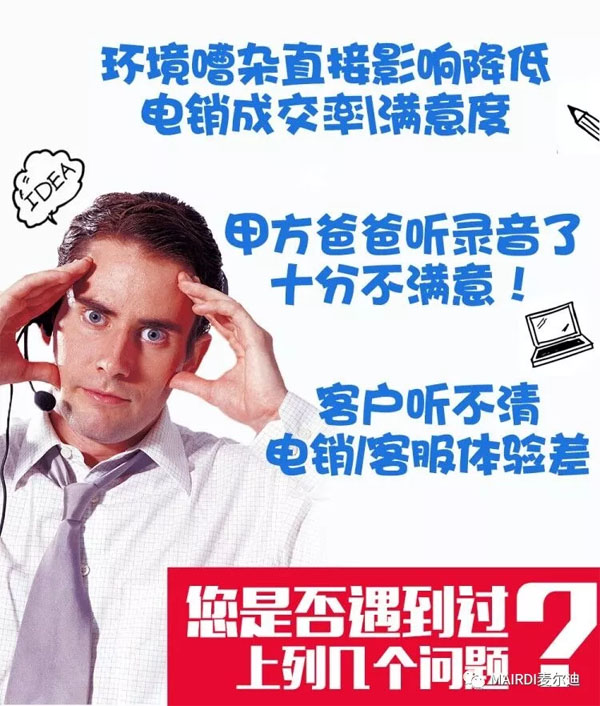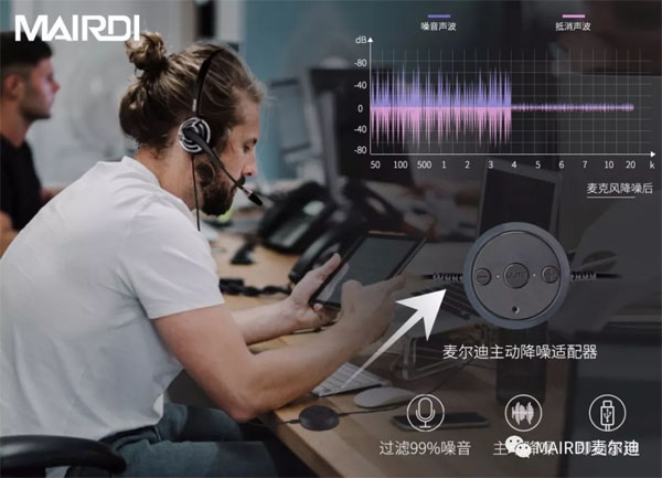 麥爾迪主動降噪方案,創新將主動降噪技術與麥克風降噪結合,主動收集背景環境噪音,通過反向聲波處理進行噪音過濾,無需加大加高工位,普通的辦公桌即可,無論是同一個辦公環境內有幾十幾百個甚至更多工作人員同時通話,也能保證客戶端只會聽見坐席人員一個人的聲音,省心省力效果顯著!