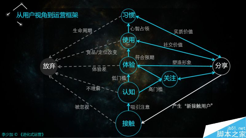 首先運營不是簡單一下就把潛在用戶變成一個習慣用戶的過程。恰恰相反,運營是循序漸進、環環相扣而使潛在用戶轉化成習慣用戶的一個漫長過程,而且這個過程當中,這些用戶還會不斷的影響他生活軌跡中的其他用戶。這一系列的認知非常重要,從用戶視角來看,所有人從接觸、認知、關注、體驗、習慣,所有的過程都是一致的、統一的、穩定的。