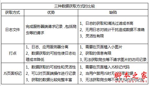 流量數據獲取主要分3類:網站日志文件、打點、JS頁面標記。它們的區別如下:
