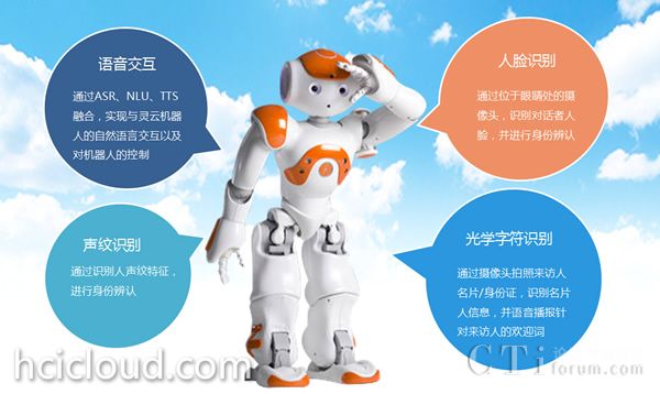 相比于虛擬的智能客服系統,實體機器人具有良好的用戶親和性,靈云機器人整合了靈云平臺(hcicloud.com)語音交互(ASR、NLU、TTS),聲紋識別(VPR),人臉識別(AFR),光學字符識別(OCR)等核心人工智能技術能力,使機器人能說、會聽,能寫、會看,還可以實現身份認證等操作。